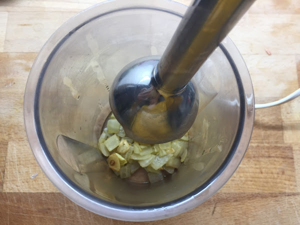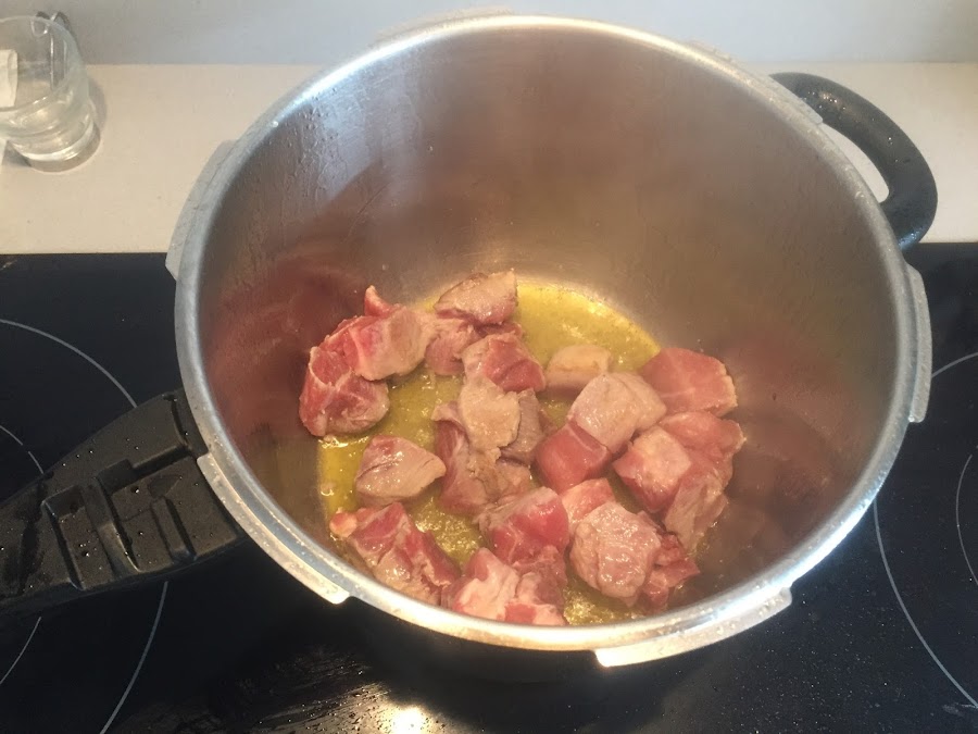 Cuando esté listo el sobrito, lo pasamos a un vaso de batidora, batimos y reservamos. Mientras, sellamos en el aceite que hemos utilizado anteriormente, el magro de cerdo. Recordad que el aceite debe estar muy caliente para realizar correctamente este paso.