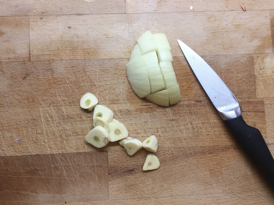 Primero pelamos y cortamos los ajos y la cebolla, y la sobreímos con un poquito de aceite en la olla que vayamos a utilizar. Yo he utilizado una olla rápida.