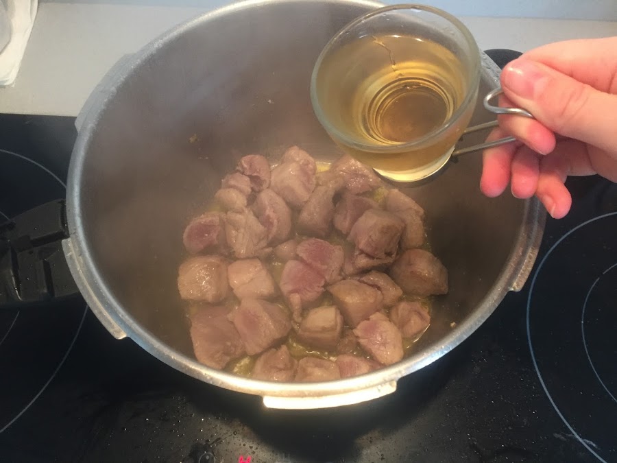 Una vez sellado el magro, bajamos el fuego a fuego lento y añadimos el vasito de vino, el puré que hemos hecho con el sofrito, las especias a nuestro gusto, como la sal, la pimienta, el perejil y la nuez moscada; y mezclamos.