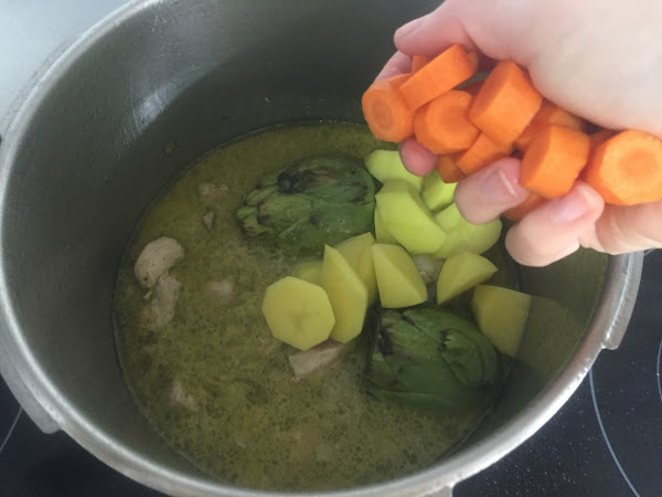 A continuación, cubrimos con agua todo lo anterior. Pelamos y cortamos las patatas y las zanahorias en trocitos mas o menos pequeños, y los añadimos a la olla.