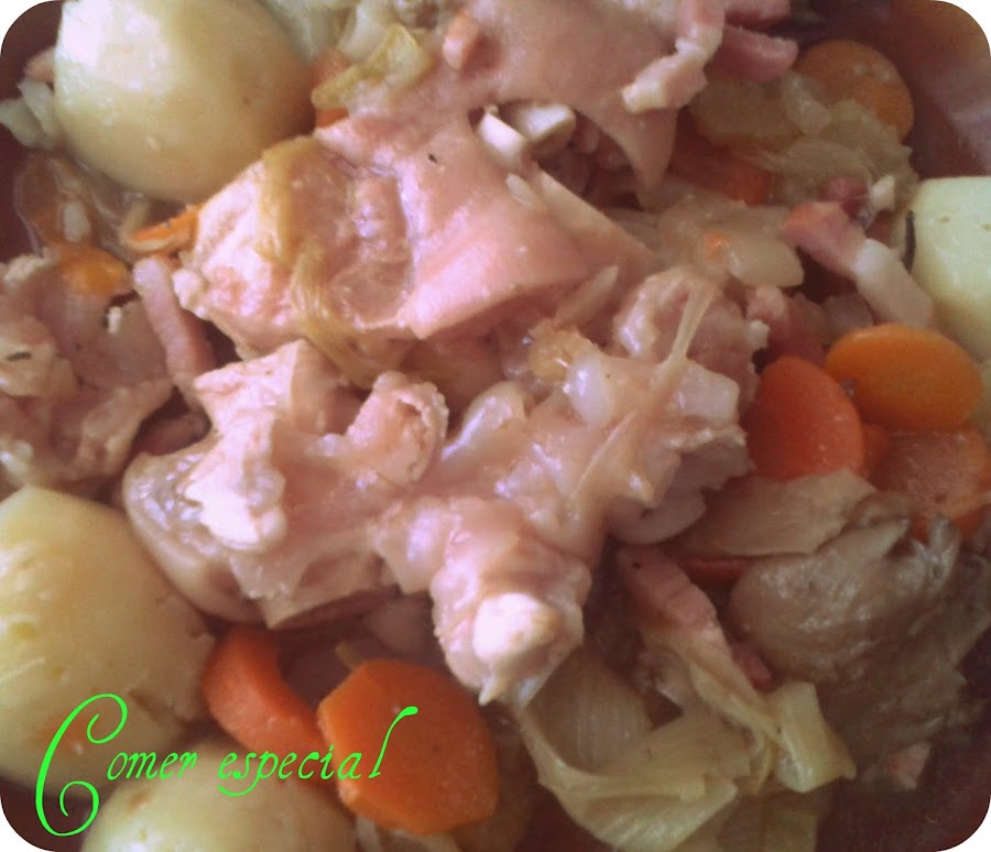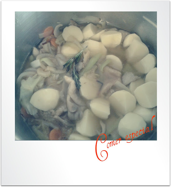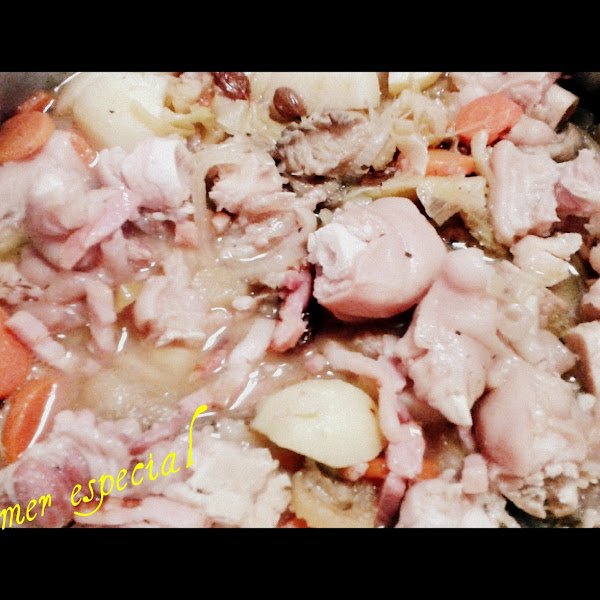 INGREDIENTES PARA DOS COMENSALES: 4 manitas hermosas frescas o saladas, 100 gramos de setas, 2 zanahorias hermosas en rodajas, 1 cebolla cortada toscamente, 3 ajos enteros y golpeados, 1 buen puerro en tiras, apio, romero, bacón, papas pequeñas para poner enteras o cascarlas (de 4 a 6 por comensal), agua, aceite de oliva, laurel, restos de verduras, dos vasos de vino, medio de coñac o brandy, ajo en polvo o, si se puede, pimienta y un buen puñado de pasas.