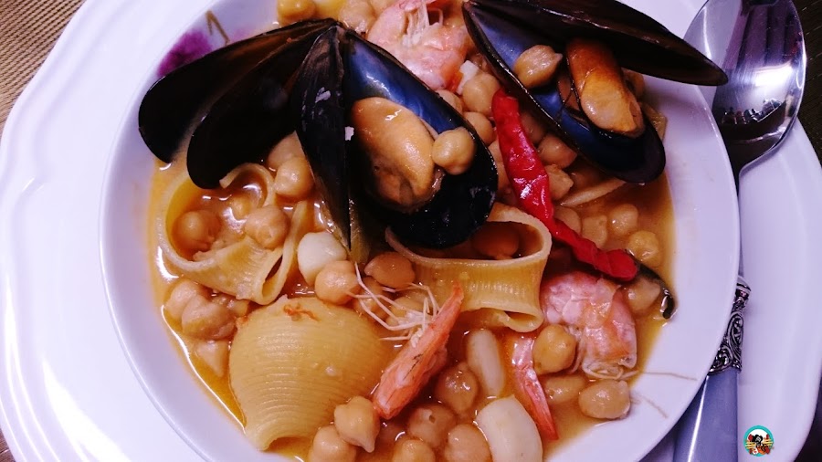 Un guiso que bien sería una especie de potaje de mariscos con garbanzos y los que me encontré en la cocina, diría mi madre.