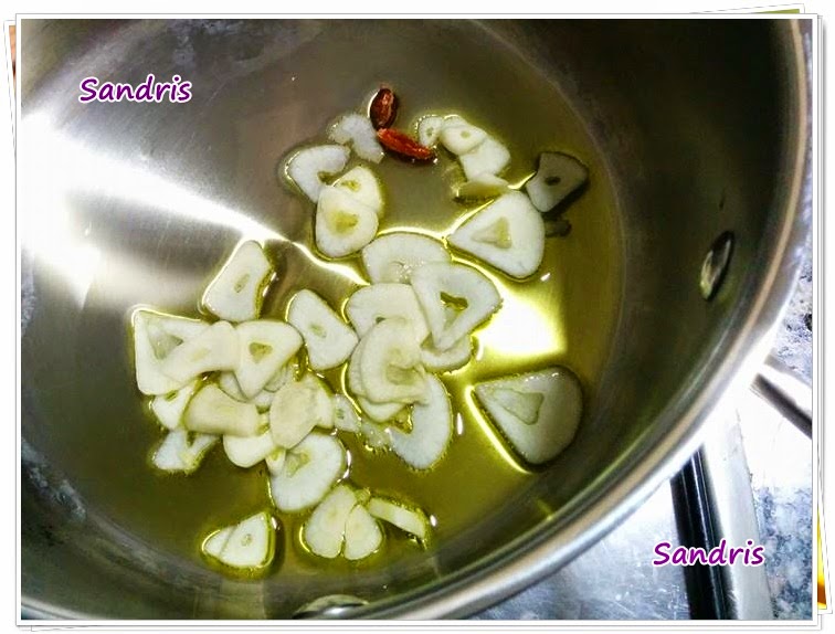 Un poco de harinaY empezamos la fiesta!!! Primero, laminamos los ajos y lo sofreímos junto con las guindillas. Cuando el ajo esté ya bien doradito, lo retiramos todo para que no se queme. En casa no nos gusta comer el ajo así tal cual, si está picado sí, pero si no, normalmente lo solemos tirar. Pero vamos que si a alguien le gusta, pues que no lo tueste tanto y así se puede dejar en el mismo guiso.