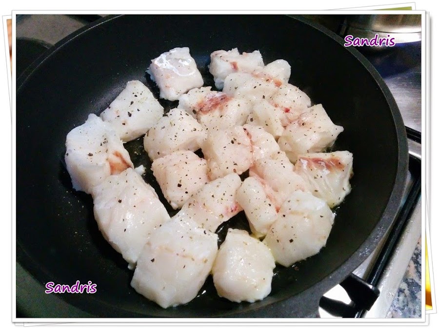 Por otra parte, sellamos los taquitos de merluza en una sarten (yo le puse un poco de pimienta negra) y lo agregamos a la olla. Y nada más, lo dejamos cocer unos 5-10 minutos más y listo!!!! Un guiso de pescado bien rico y sabroso!!!