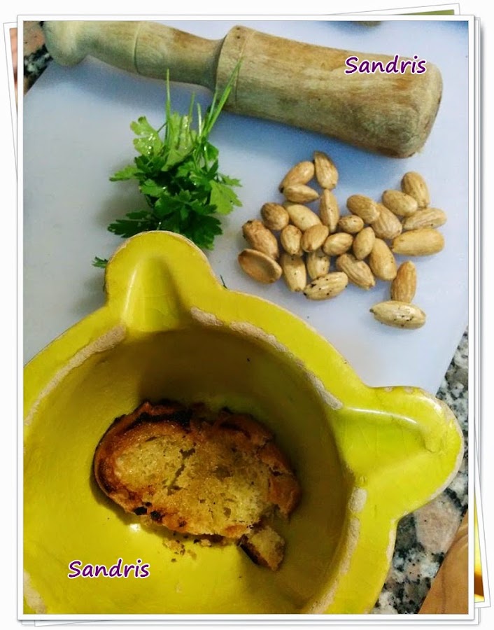 Con un mortero, machacamos la rebanada de pan, las almendras, el perejil y el tomillo. Lo ponemos en la cazuela y luego agregamos los pimentones y la cucharadita de harina. En casa gusta el picante, así que le he echado un poco de pimentón picante para que le de un toquecito, pero si no os gusta el picante, pues se quita y ya está, sin problemas.