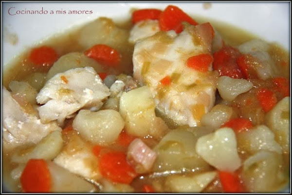A mi me gusta servirla ya sin las espinas, en un plato las preparo y cuando tengo listas las mollitas las paso a los platos y les añado el caldo con las patatas y verduras.