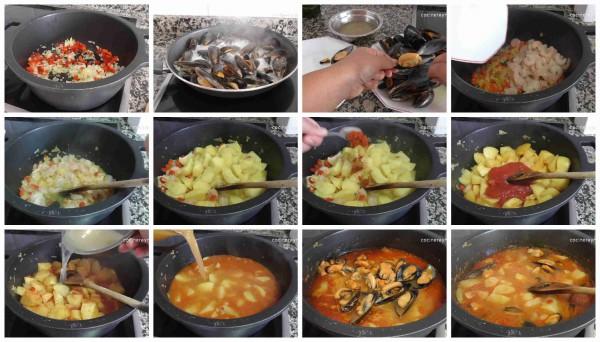 Una vez que empiece a hervir dejamos unos 35 o 40 minutos hasta que las patatas estén cocidas; en los últimos 5 minutos antes de terminas el guiso de patatas a la marinera le añadimos los mejillones que teníamos reservados.