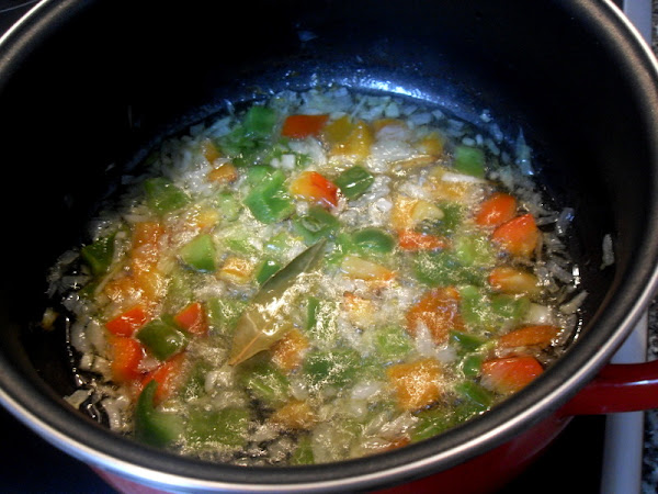 Elaboración:Pelar y picar finamente la cebolla. Lavar, cortar y picar en daditos los pimientos. Pelar y picar muy fino los ajos.