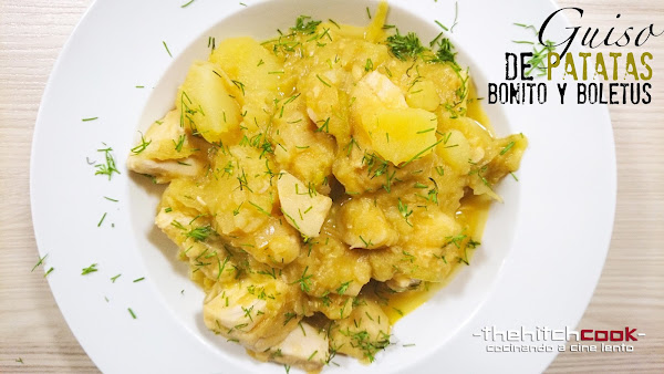 En el último momento añadimos los tacos de bonito y dejamos que se hagan un par de minutos con el calor residual. NOTA: Si vais a tomar el guiso al día siguiente conviene no añadir el pescado, ya que nos quedaría seco a la hora de recalentarlo. Mejor calentar el guiso de patatas por un lado y luego incorporar el bonito.
