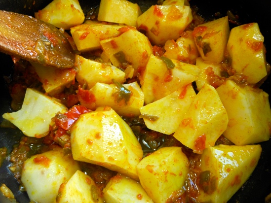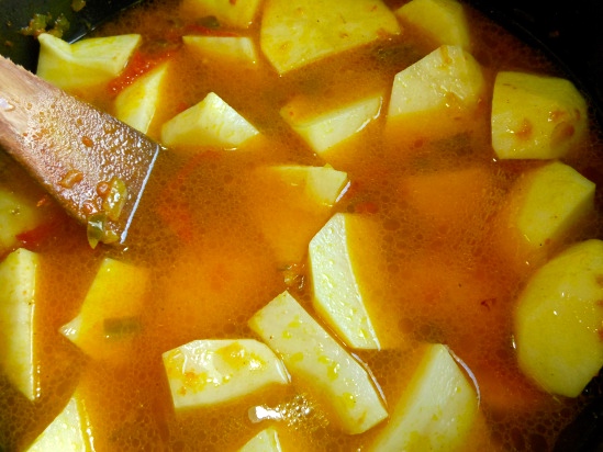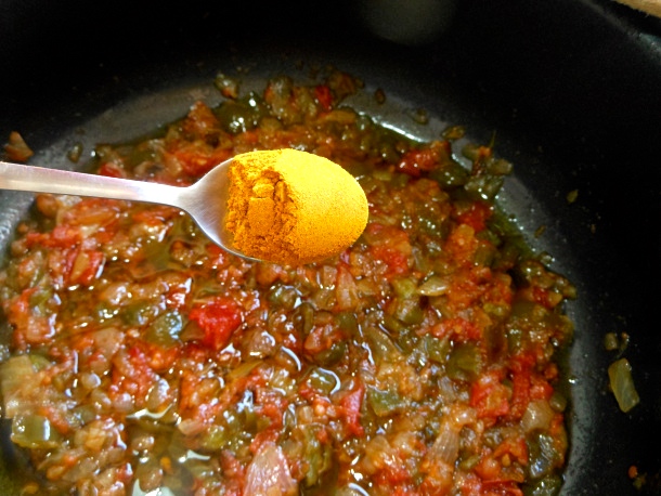 Cuando el tomate esté deshecho agrega la cucharadita de curry y remueve con tu cuchara de madera.