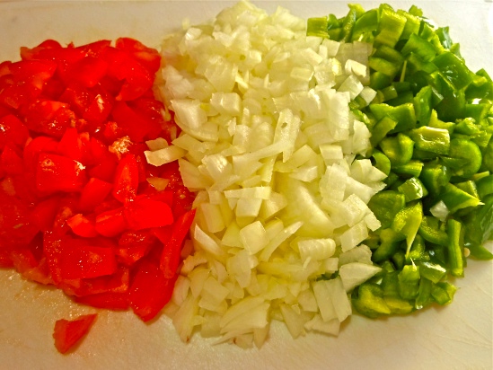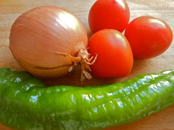 Lava bajo el chorro del agua fría del grifo los tomates y el pimiento verde, tras esto seca bien con un trozo de papel de cocina ambas hortalizas y pícalas.