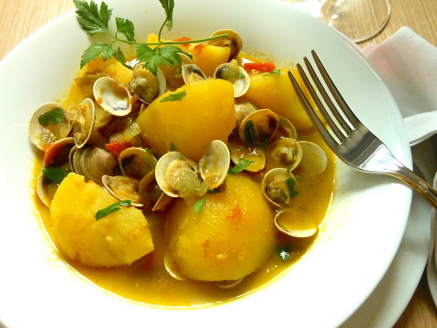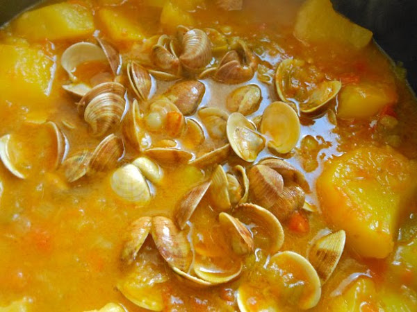 Cuando las patatas estén tiernas, vuelca la sartén con las almejas, los ajitos y el líquido que haya en la sartén. Remueve con tu cuchara de madera, calienta el guiso y sirve.