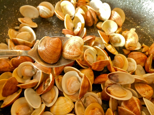 Cuando los dientes de ajo estén dorados añade las almejas, tapa la sartén y espera hasta que todas las almejas se hayan abierto. Retira las almejas que se hayan quedado cerradas y aquellas que estén rotas. Reserva.