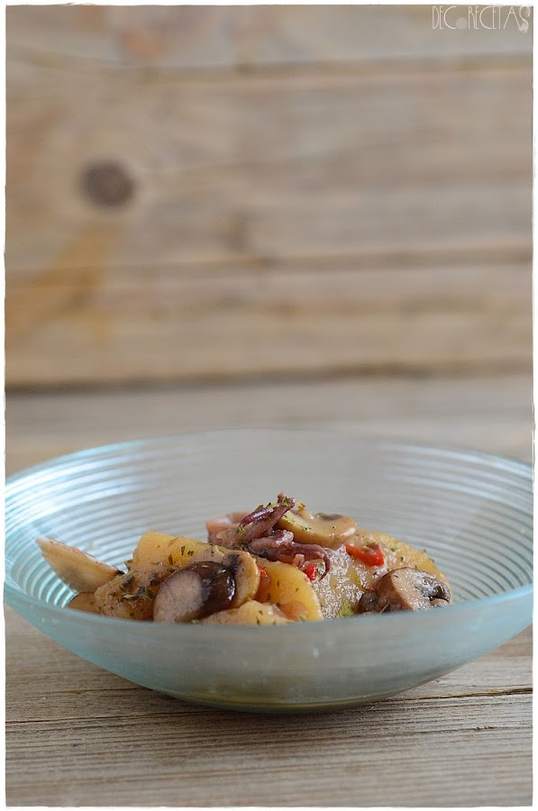 Pochamos la cebolla y pochamos. Añadimos las almejas y calamares, las dejamos un minuto y añadimos el brandi que flambeamos. Por último, agregamos las guindillas y las patatas. Añadimos el vino, que dejamos cocinar a fuego alto por 5 minutos, para posteriormente agregar el caldo de pollo y dejaremos a fuego bajo por unos 30 minutos, removiendo de vez en cuando para evitar que se queme. Los champiñones los haremos a la plancha y agregaremos en ultimo momento junto con el perejil picado