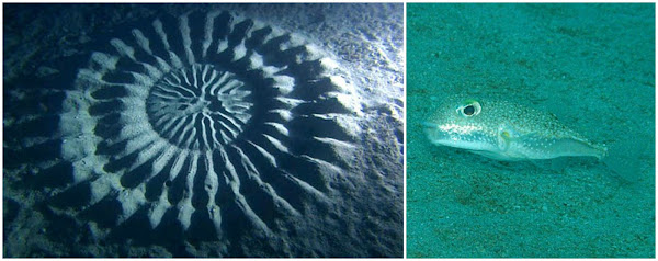 Se han encontrado misteriosas figuras realizadas en la arena del fondo marino. En 1995 apareció, en el fondo del mar al sur de la isla Amami-Oshima en la zona subtropical de Japón, una estructura circular de unos dos metros de diámetro. Su origen era desconocido. ¿Corrientes marinas? ¿Alienígenas? ¿Fenómenos paranormales?... Varias fueron las más variopintas hipótesis hasta que en 2011 unos investigadores descubrieron que todo era obra de un pequeño pez de 12cm de la familia del "pez globo". Estos precisos dibujos acuáticos son una forma de cortejo. Este pececillo puede pasarse más de una semana batiendo sus pequeñas aletas hasta crear el "cebo amatorio" perfecto decorándolo al final con trozos de concha y de coral. El dibujo en la arena en realidad es un nido en el que la hembra, solo si está satisfecha con el trabajo, pondrá sus huevos. (Info: verne.elpais.com)
