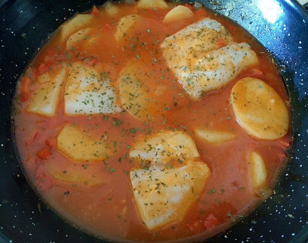 8. Pasado el tiempo, cuando las patatas ya esté casi blanditas, hacemos hueco entre ellas, colocamos el bacalao y espolvoreamos el perejil. Dejamos a fuego bajo un rato. Si las patatas ya están blandas con 10 ó 15 minutos será suficiente para que el bacalao esté hecho. Yo he preferido dejar el guiso un poco más de tiempo a fuego bajo. Al final rectificamos de sal si fuera necesario.