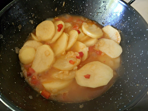 3. Se incorporan las patatas a la cazuela y removemos para que se mezclen bien con el sofrito de cebolla y pimiento.