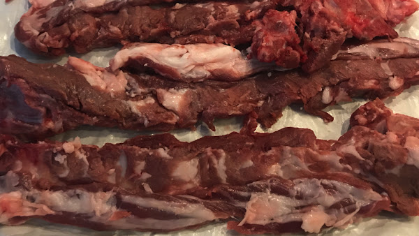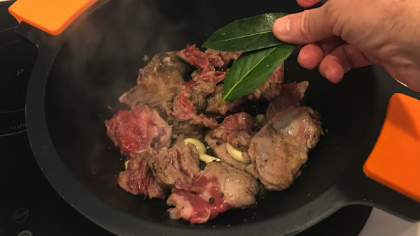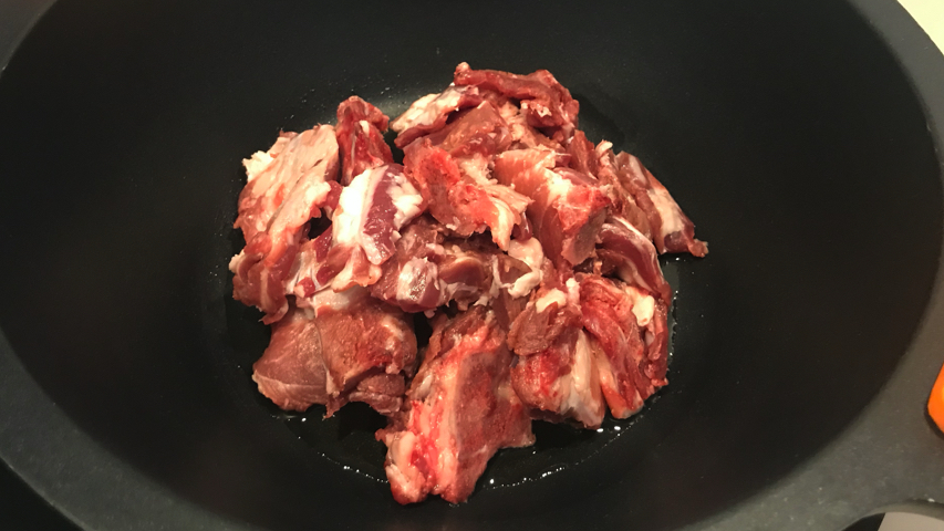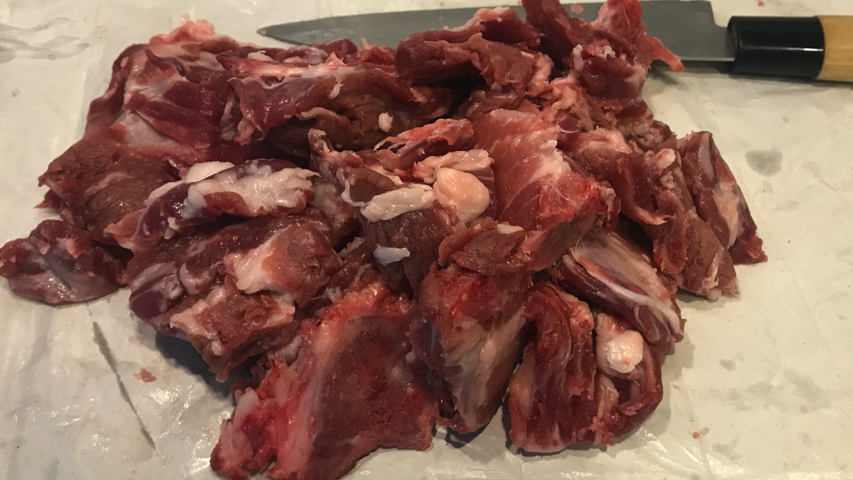 Limpia la carne, trocéala y retira la mayor parte de la grasa.
