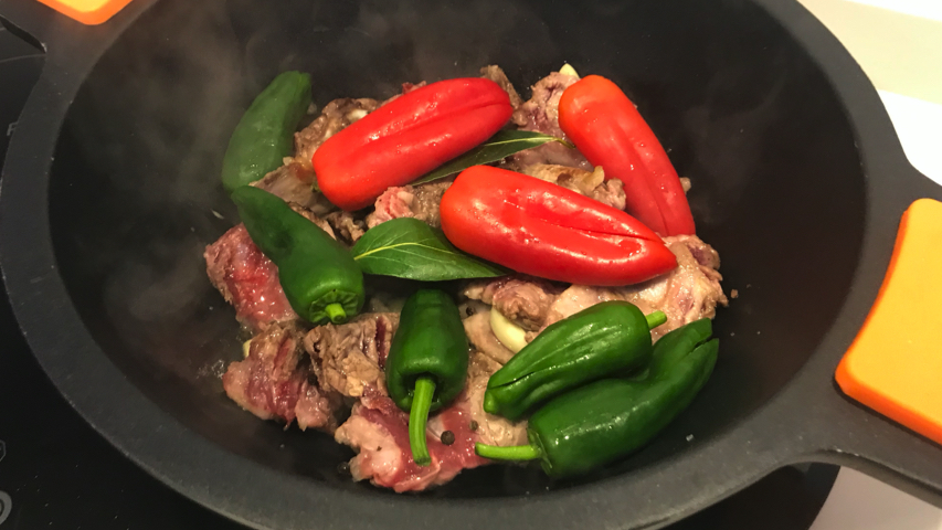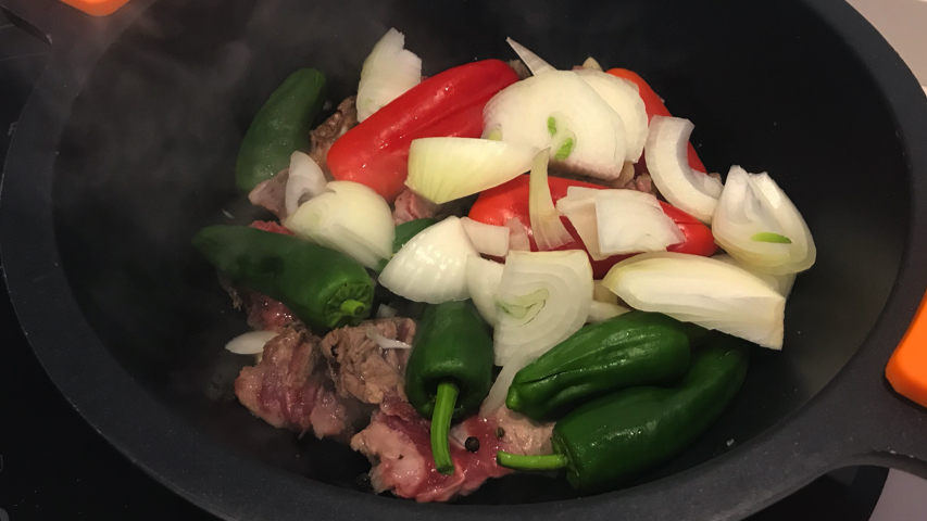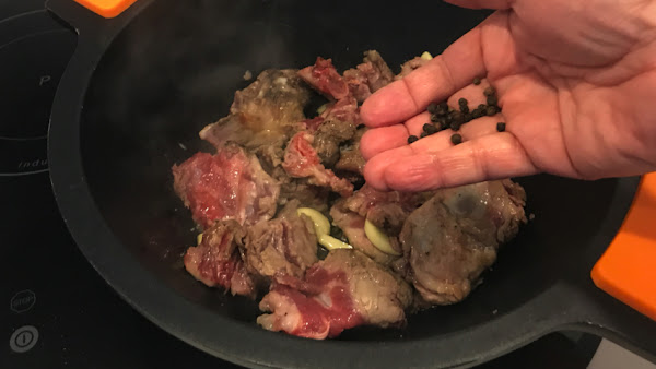 Añade los ajos, los granos de pimienta, el laurel, los pimientos y la cebolla.