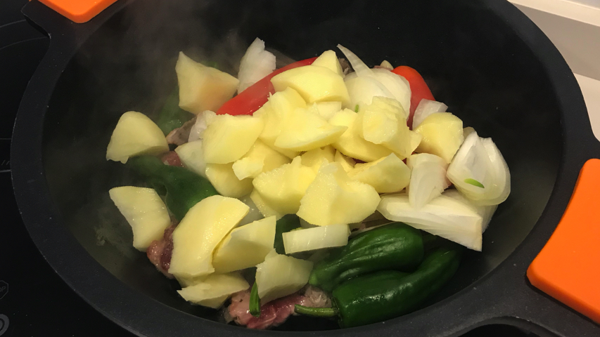 Incorpora la patata en trocitos pero chascándola como ves en el vídeo.