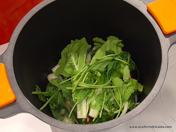 Incorporamos a la marmita las acelgas y las espinacas que teníamos un poco pochas en la nevera.