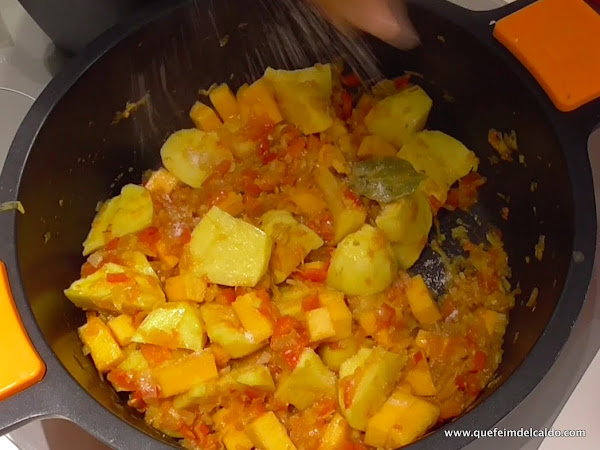 Incorporamos todas las patatas a la cazuela.