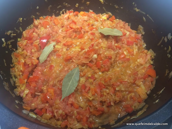 Ponemos las tres hojas de laurel y dejamos cocinándose 10 minutos más hasta que se evapore el líquido del tomate.