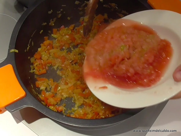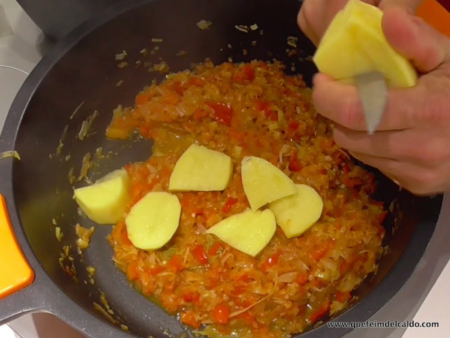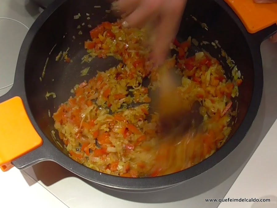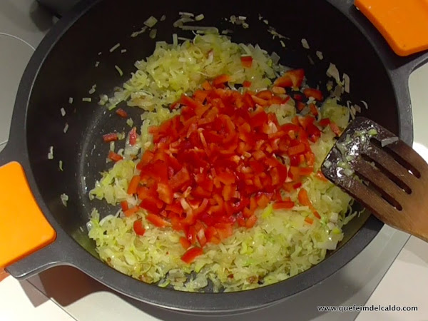 Ahora incorporamos el pimiento rojo, y lo dejamos 10 minutos más.