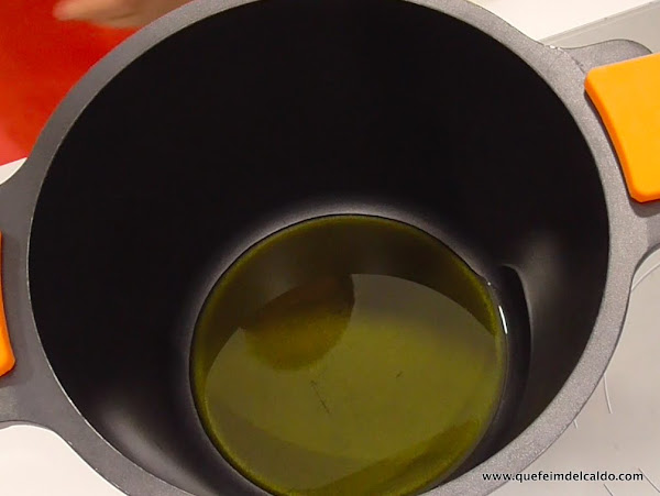 Empezamos con el fumet, ponemos 3 cucharadas de aceite de oliva en el fondo de una marmita.