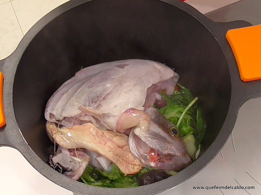 Ponemos la cabeza del pargo y la cabeza de rape en la olla.