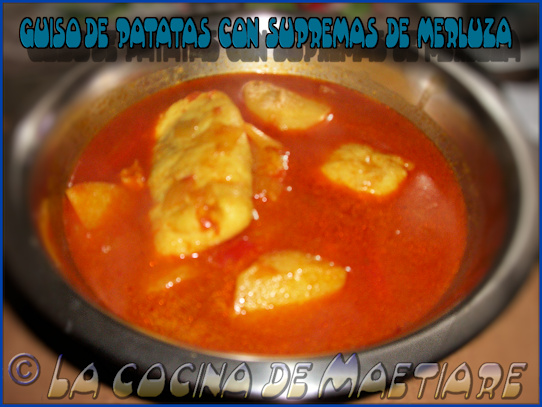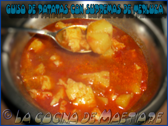 Removemos bien y cocemos tapado a fuego medio hasta que la patata esté casi cocida, entonces añadir la merluza (ya descongelada) repartiéndola por toda la cazuela. Ya no removeremos más para no deshacer el pescado y cocemos 5 minutos más.