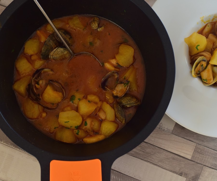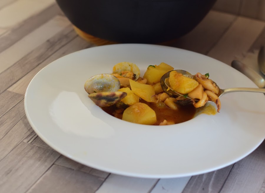 6. Cubrimos con caldo de pescado, rectificamos de sal y cocemos 30 minutos, hasta que este cocidas las patatas.