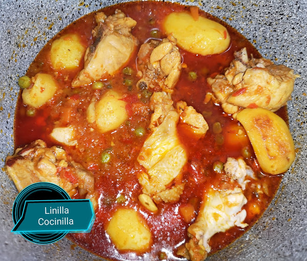 4. Agregamos las verduras y sofreímos en el aceite que hemos dejado en la cubeta, mezclamos y después de un par de minutos agregamos la zanahoria en cuadros pequeños, los guisantes, el tomate en conserva, las especias y las patatas. Mezclamos bien todos los ingredientes y después de unos minutos agregamos el pollo reservado. Integramos los ingredientes y cancelamos el menú sofreír. Ponemos la tapa y programamos menú guiso/140ºC/10 minutos/media presión/válvula cerrada.