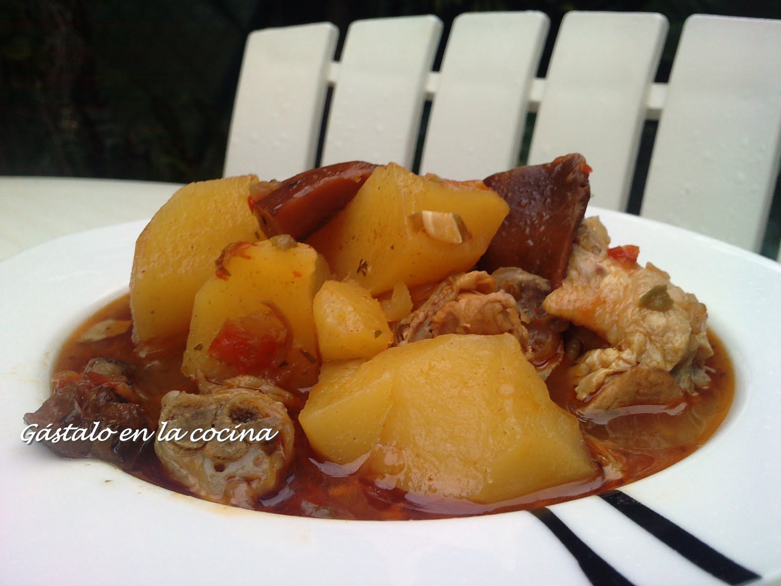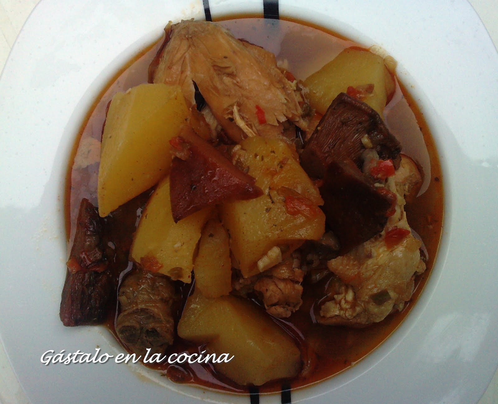 Es muy sencillito y sabroso, os recomiendo hacerlo.Ingredientes para 4 personas:1 pollo entero cortado en trozos (yo le he quitado la mayor parte de la piel)1 cebolla grande1 pimiento verde pequeño1 pimiento rojo pequeño8 dientes de ajopimienta negra molidacaldo de cocido (yo le he puesto 2 cubitos de caldo de cocido)1 cucharada generosa de pimentón dulceun cuarto de vaso de vinoun cuarto de vaso de brandy, cognac u otro licor parecido150 gramos de jamón serrano en tacos150 gramos de chorizo en tacos2 patatas grandesníscalos (al gusto, unos 300 gramos)perejilaceitePreparación:En una cacerola un poco alta ponemos un poco de aceite y echamos los pimientos muy muy picaditos, después la cebolla y la mitad de los ajos también muy picados y dejamos que cojan un poco de color; echamos el pollo y cuando se haya dorado echamos los tacos de jamón y de chorizo, la pimienta negra y el pimentón dulce; damos unas vueltas y agregamos el vino y el brandy. Dejamos que se evapore el alcohol y añadimos el caldo de cocido (yo añadi agua en la que diluí los cubitos de caldo de cocido). Añadiremos agua hasta cubrir rasamente el pollo y dejaremos que se haga durante 40 minutos primero a fuego alto hasta que hierva y luego lo bajamos que se haga lentamente.Por otro lado en una sartén ponemos el resto de los ajos picados con un poco de aceite, añadimos los níscalos y damos unas vueltas, después las patatas cascadas (les damos un corte pero al final las rompemos para que suelten el almidón, que no sea un corte limpio con el cuchillo sino desgarrando la patata) y dejamos que se doren a fuego fuerte y añadimos el perejil picado y un poco de sal. Pasados los 40 minutos añadimos las patatas con los níscalos a la cacerola y dejamos hasta que las patatas se hagan.Nota: yo he desgrasado el guiso antes de incorporar las patatas con los níscalos: una vez que lleva el pollo 4o minutos saco el aceite sobrante que se posa por encima del guiso ayudandome de un cucharón