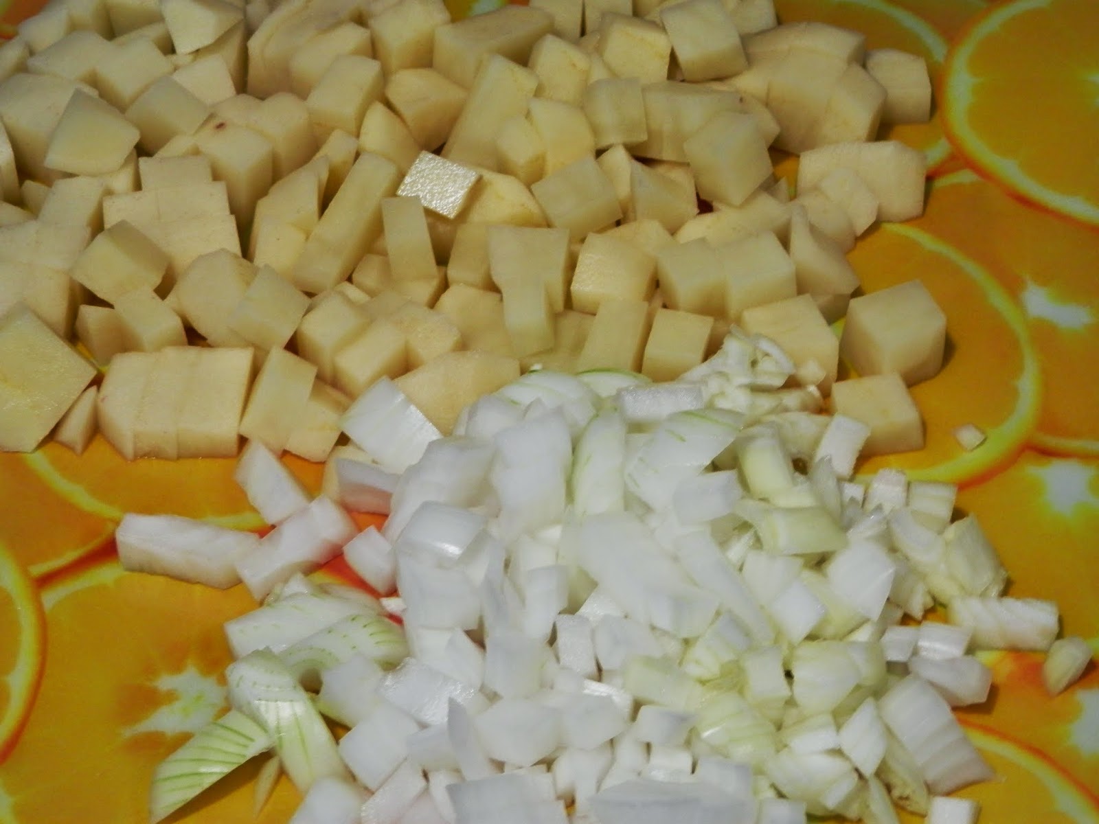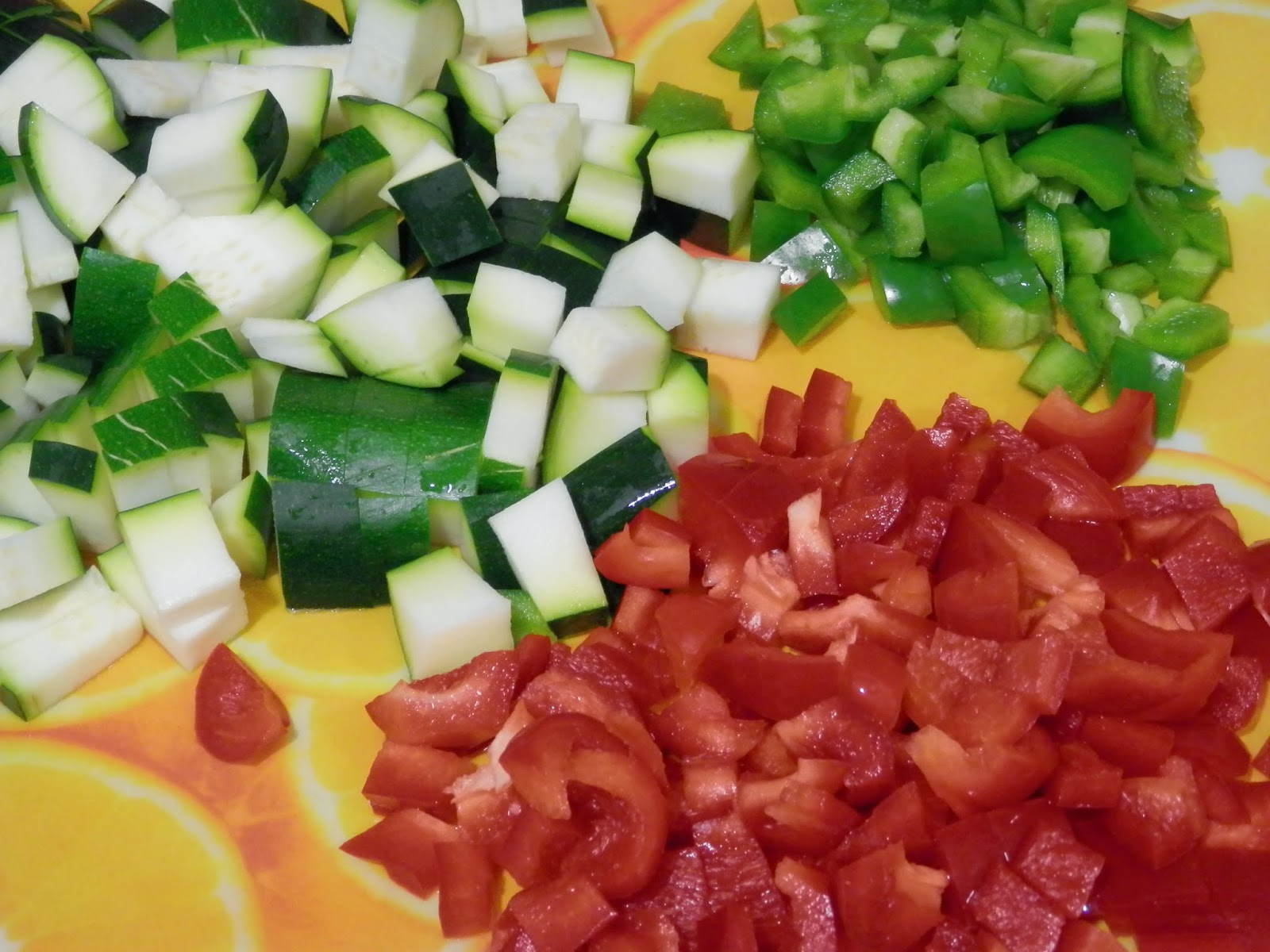 Cortamos todas las verduras y los orejones en trocitos pequeños.