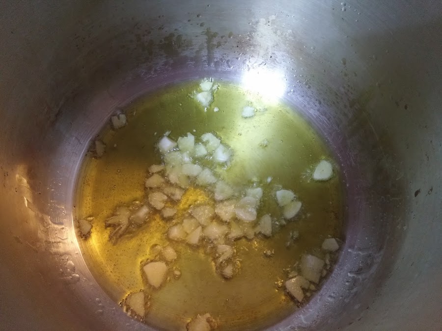 En la olla exprés echamos un buen chorreón de aceite de oliva y vamos a dorar los ajos cortados en láminas.