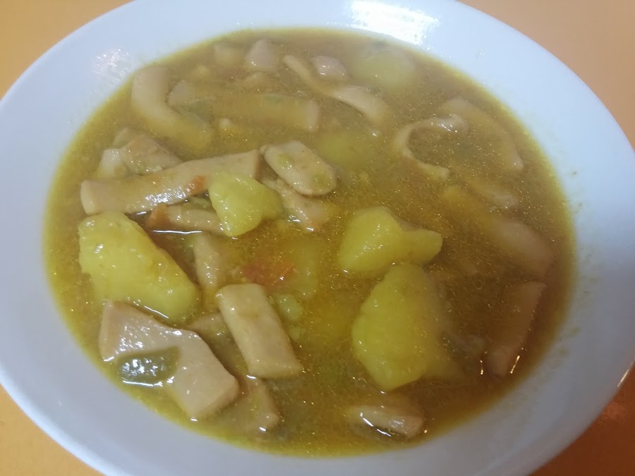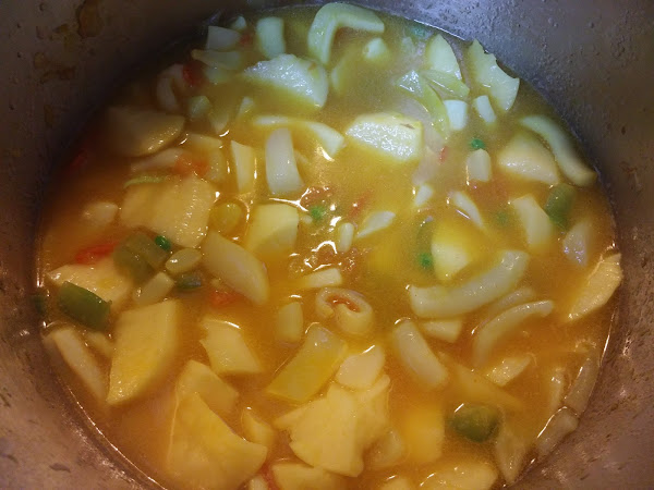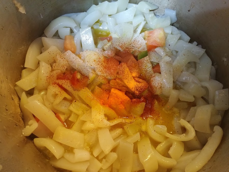 Ahora añadimos la pota cortada en trozos, el pimentón, el colorante y la cúrcuma.