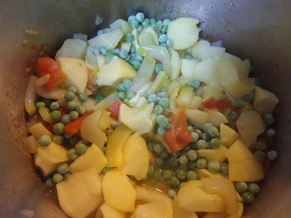 Echamos el vino blanco, las patatas cortadas a trozos y los guisantes.