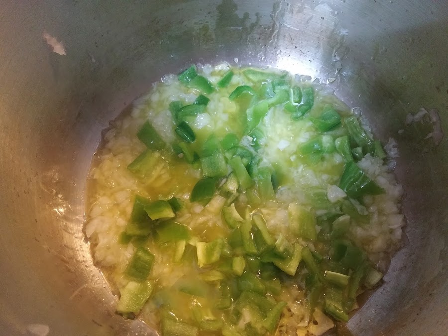 Cuando empiecen a dorarse, cuidado de que no se quemen, añadimos la cebolla bien picada y el pimiento a trozos pequeños.