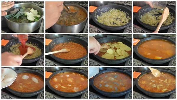 Empezamos preparando el caldo de pescado; para ello ponemos todos los ingredientes en una cazuela amplia con abundante agua y una vez que empiece a hervir dejamos 20 minutos.