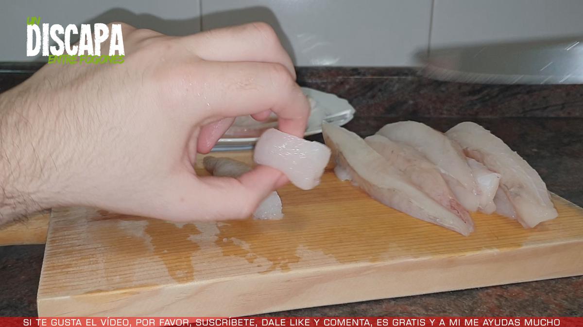 Y aquí tengo los lomos de rape ya limpios, que vamos a cortar el pedazos medianos, más o menos de este tamaño.