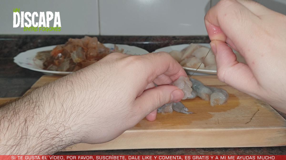 3Aquí tengo unos langostinos que vamos a pelar, y una vez pelados le quitamos el intestino, para ello, tiramos del intestino con suavidad y poco a poco ira saliendo.