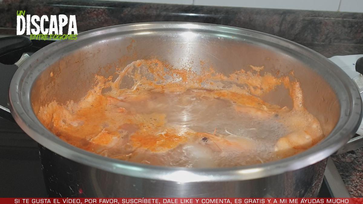 Añadimos las cáscaras y las espinasa una cazuela, las cubrimos de agua y dejamos que hierva durante unos 20 o 25 minutos.