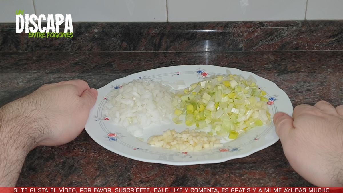 También vamos a trocear finamente una cebolla o cebolleta y la reservamos junto al ajo.