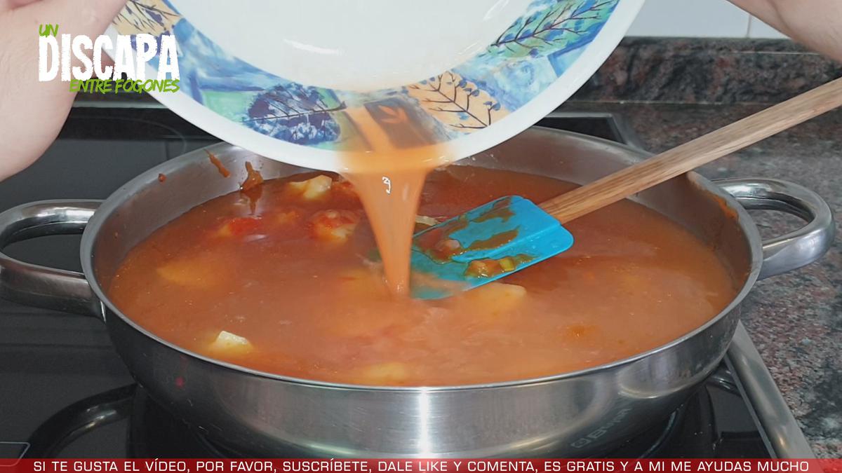 Después, añadimos la salsa de tomate, removemos bien, le ponemos una hoja de laurel y cubrimos con el caldo que habíamos preparado anteriormente.
