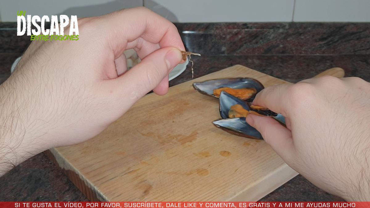 8Mientras tanto, aquí tengo unos mejillones, a los que les voy a quitar las barbas que suelen tener.