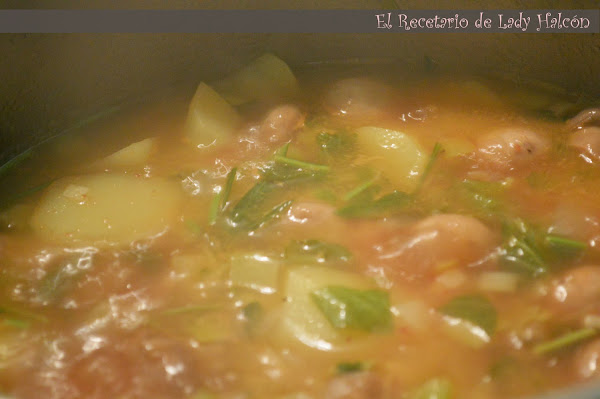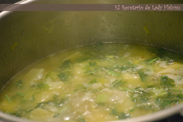 Añade las patatas y el apio, remueve y rehógalo un par de minutos más. Añade agua o caldo de pescado hasta cubrirlo todo y cuécelo durante unos 20 minutos a fuego medio, hasta que la patata comience a estar tierna.
