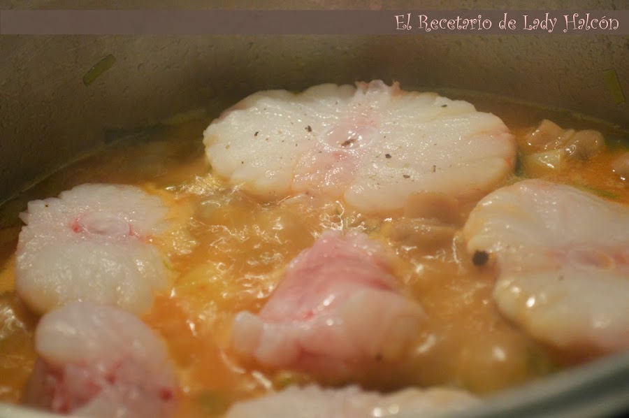 Y por último, salpimienta las rodajas de rape y añádelas al guiso colocándolas encima para que no se rompan. Deja que cueza durante 10 minutos aproximadamente, hasta que veas que el rape está hecho.