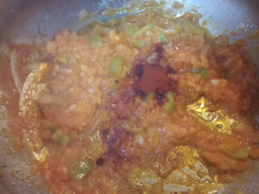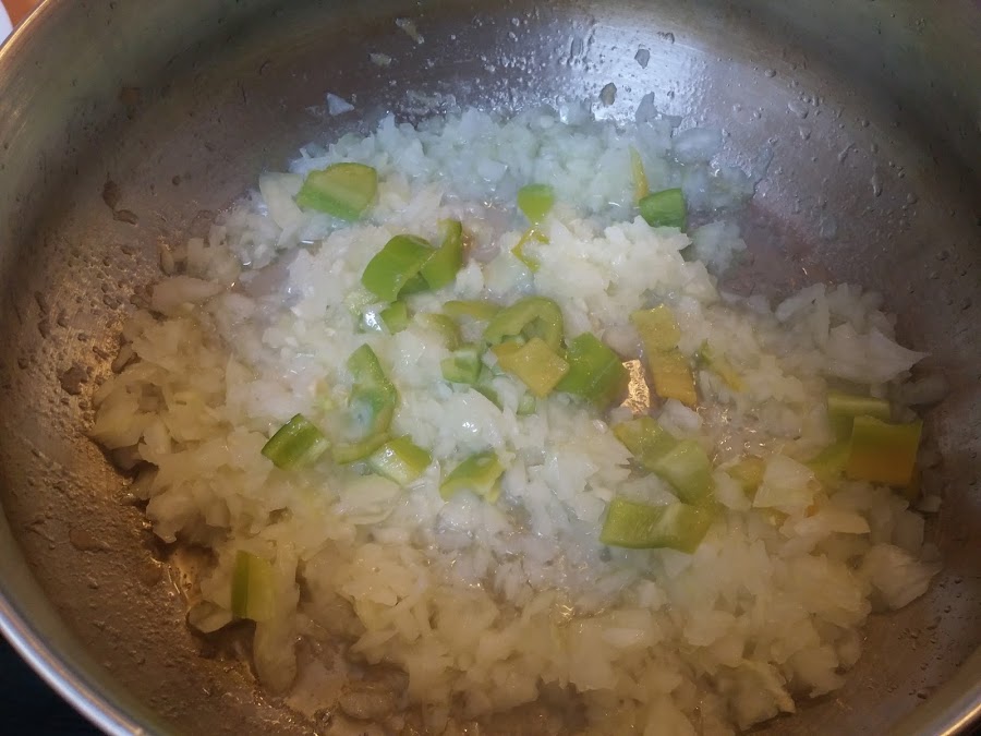Una vez lista, reservamos. En la misma cacerola, añadimos un poco más de aceite y vamos a sofreír los ajos, la cebolla y el pimiento, todo bien picadito. Salamos al gusto. Dejaremos unos 10 minutos.