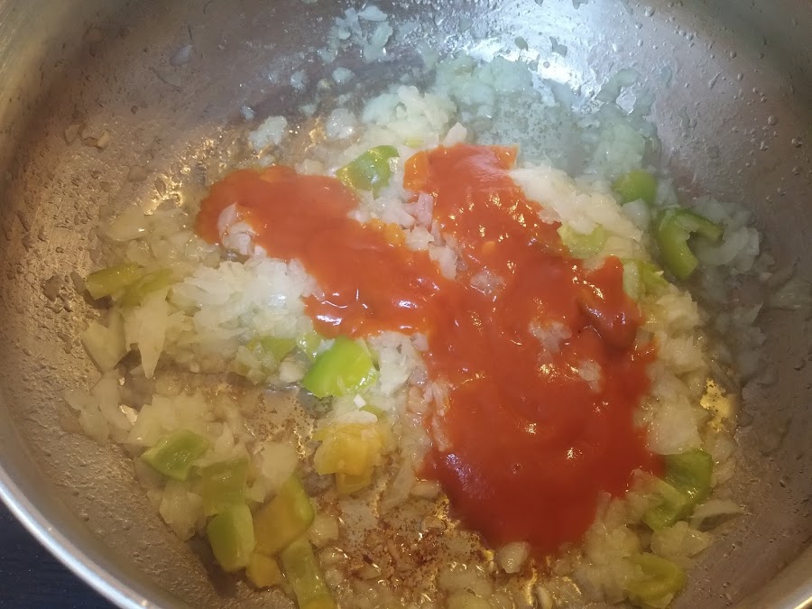 Ahora añadimos un chorreón de tomate frito. Removemos bien.